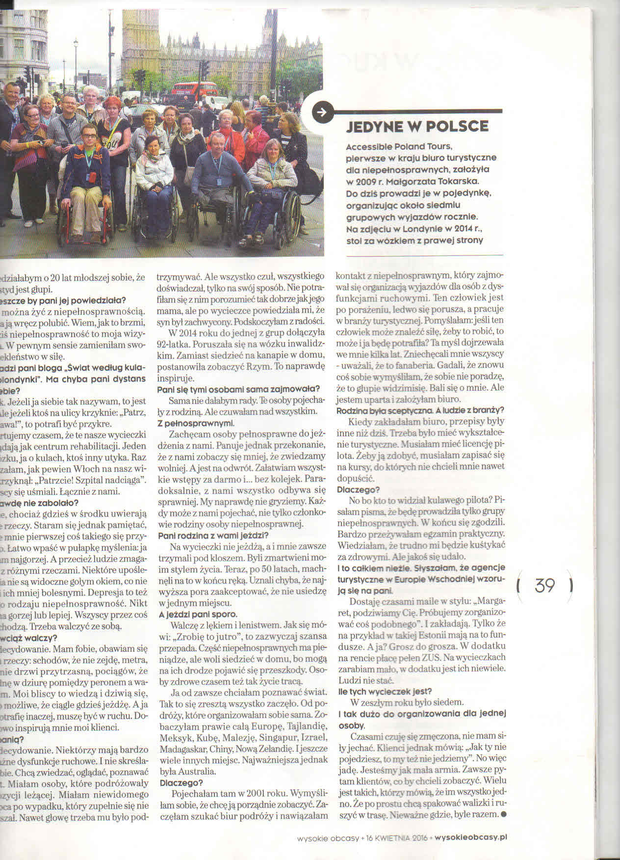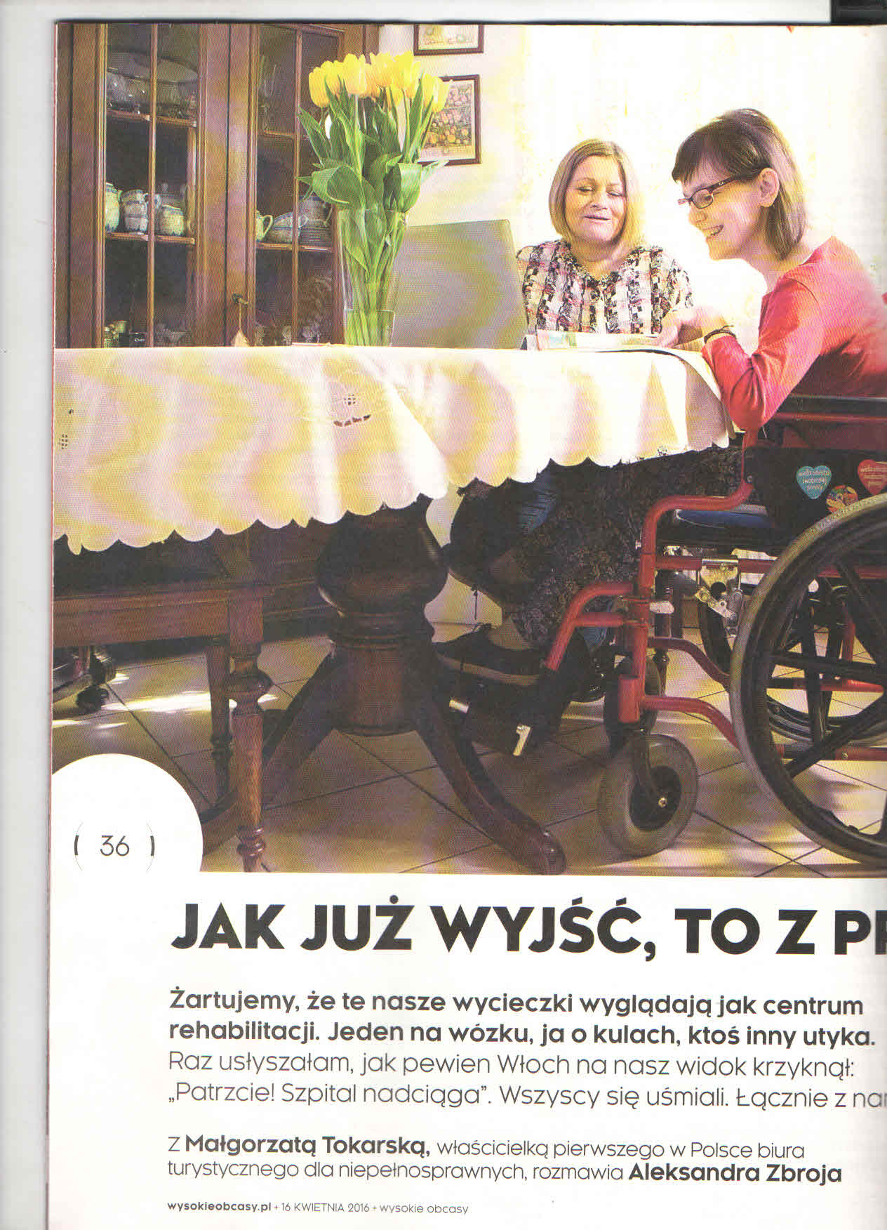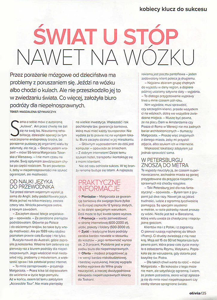 Ja również jestem bardzo zadowolona z wycieczki do Rzymu organizowaną przez panią Małgorzatę Tokarską.Jest to osoba doskonale znająca potrzeby ludzi niepełnosprawnych czy to na wózku czy o kulach czy schorowanych wolniej chodzących.Hotele są przez panią Małgosię rezerwowane tylko gdy są dostosowane dla niepełnosprawnych,to samo jest na lotnisku że grupa wchodzi z asystą dla niepełnosprawnych.Dlatego śmiało mogę zaręczyć że każdy będzie zachwycony że mimo niepełnosprawności może zwiedzać świat.Mój mąż jeździ na wózku i byłam pewna że nie dla nas już wyjazdy za granicę a tym bardziej samolotem a tu proszę byliśmy w Rzymie i jeszcze na audiencji generalnej u papieża.To wszystko dzięki pani Małgosi Tokarskiej i jej biuro dla niepełnosprawnych.Polecam gorąco Accessible Poland TOURS.