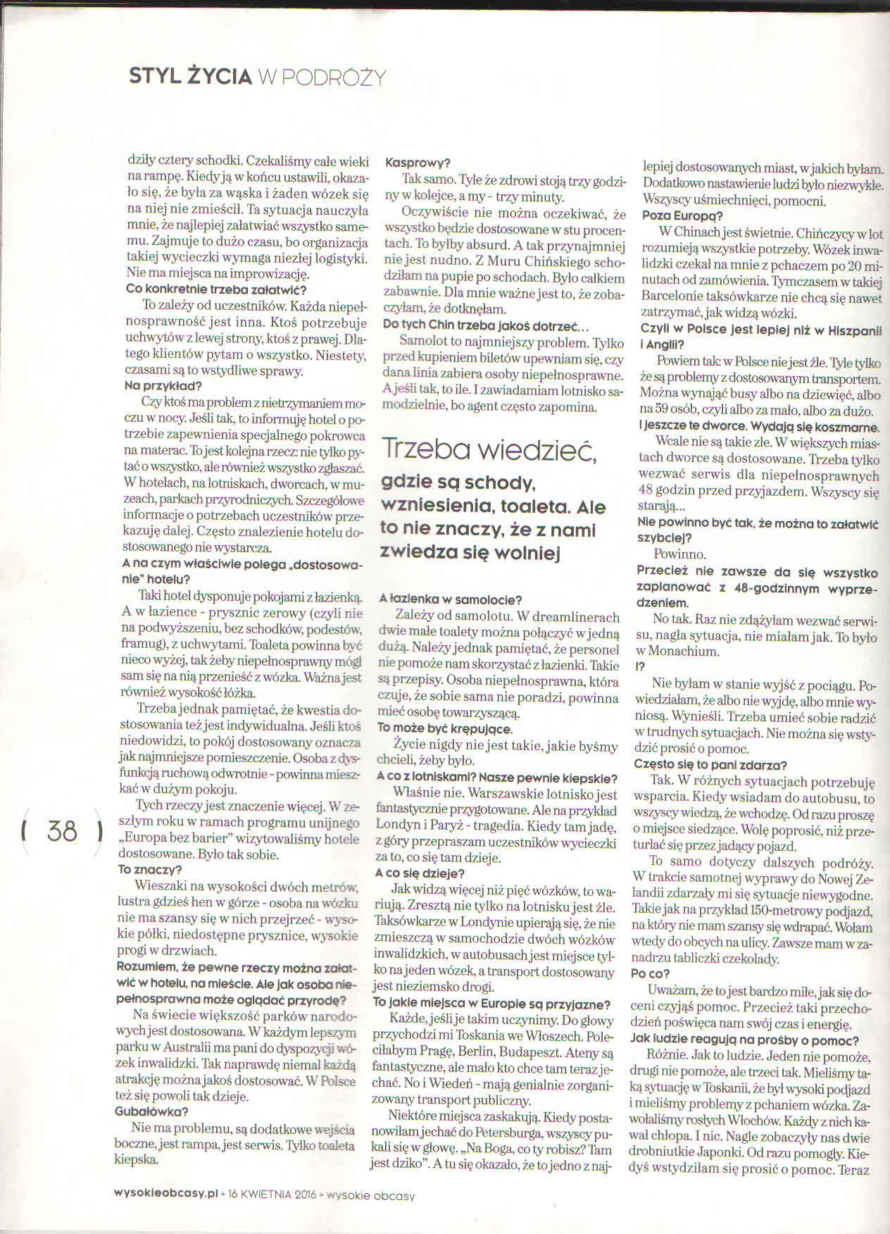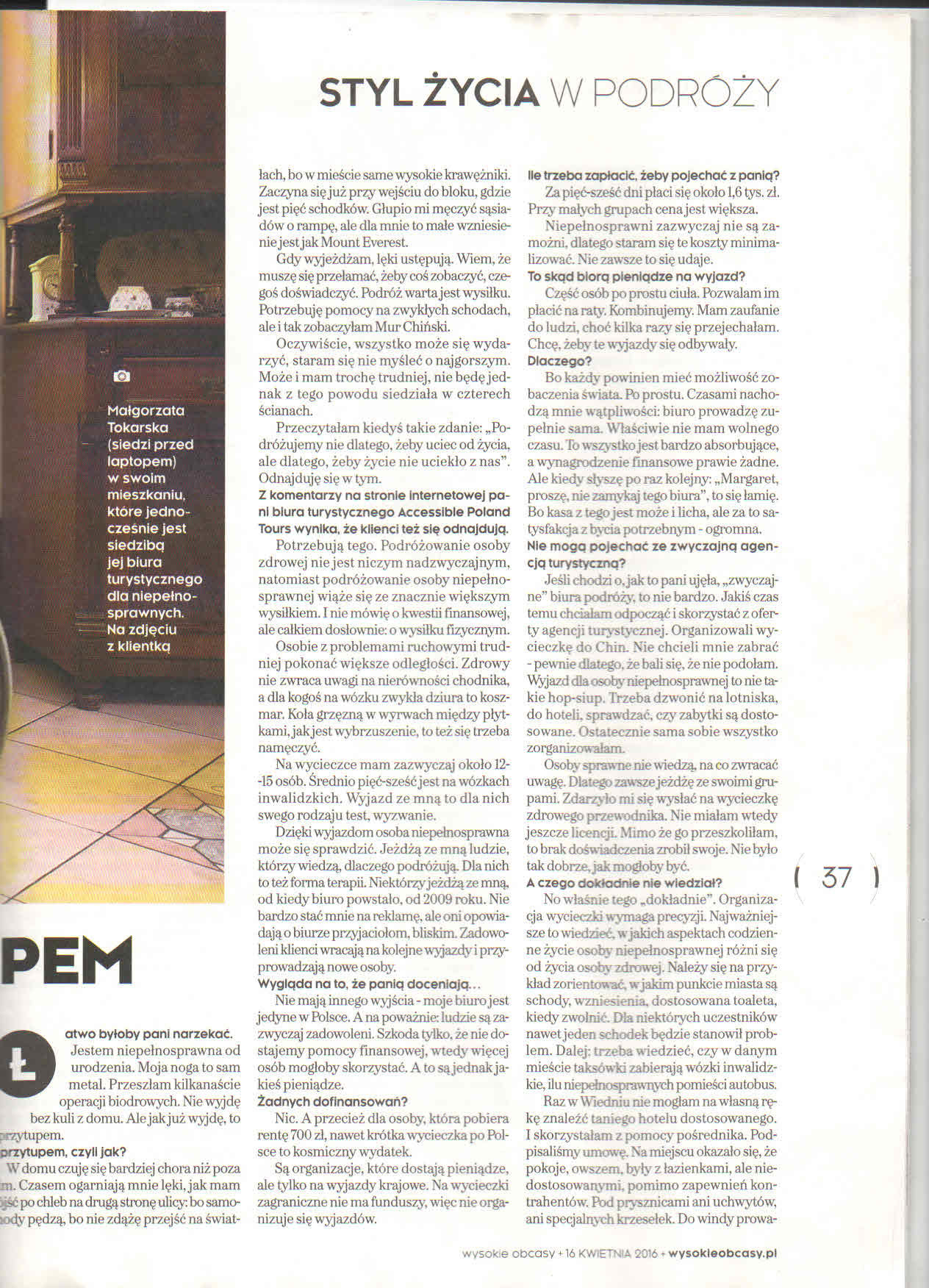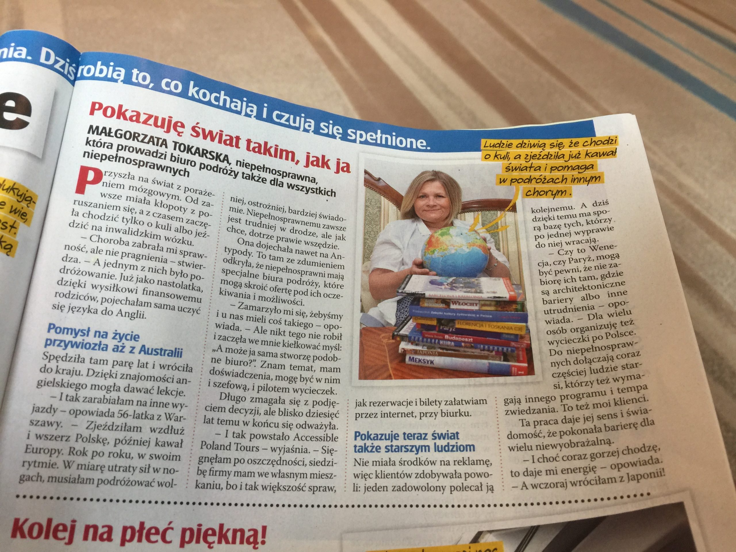 Ja również jestem bardzo zadowolona z wycieczki do Rzymu organizowaną przez panią Małgorzatę Tokarską.Jest to osoba doskonale znająca potrzeby ludzi niepełnosprawnych czy to na wózku czy o kulach czy schorowanych wolniej chodzących.Hotele są przez panią Małgosię rezerwowane tylko gdy są dostosowane dla niepełnosprawnych,to samo jest na lotnisku że grupa wchodzi z asystą dla niepełnosprawnych.Dlatego śmiało mogę zaręczyć że każdy będzie zachwycony że mimo niepełnosprawności może zwiedzać świat.Mój mąż jeździ na wózku i byłam pewna że nie dla nas już wyjazdy za granicę a tym bardziej samolotem a tu proszę byliśmy w Rzymie i jeszcze na audiencji generalnej u papieża.To wszystko dzięki pani Małgosi Tokarskiej i jej biuro dla niepełnosprawnych.Polecam gorąco Accessible Poland TOURS.